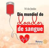 Abaixo dentro de um triângulo vermelho em letras brancas: de sangue. Terminando o card na letras esquerda o símbolo do Rotary Club de Santa Fé do Sul.