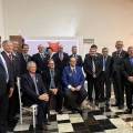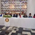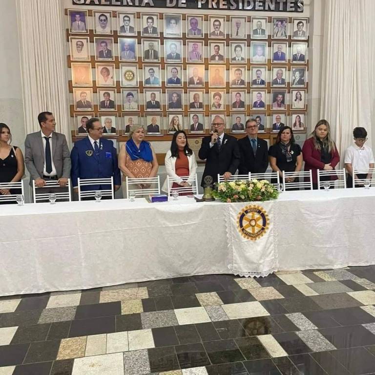 Na foto observamos oito pessoas sentadas atrás de uma mesa com toalha branca e o logo do Rotary International no centro. Atrás delas tem uma parede repleta de porta retrato com foto de rosto. Do lado direito tem uma cortina comprida do teto ao chão na cor branco. O chão tem piso quadriculado nas cores preto e tons terrosos. Sobre a mesa copos com água e garrafinhas com água. No centro da mesa o sino rotário com um arranjo de flores.